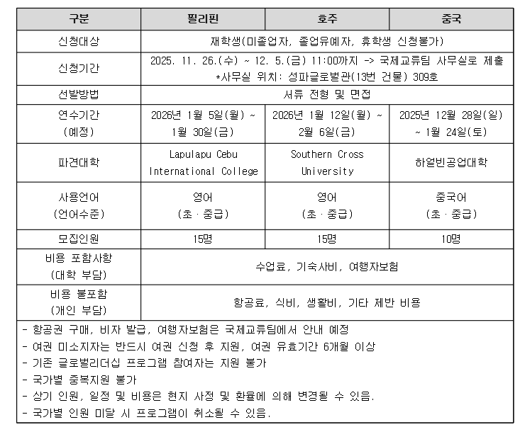 우리 대학 재학생을 대상으로 「2025학년도 동계 글로벌리더십 프로그램」을 다음과 같이 실시하오니 재학생분들의 많은 참여 부탁드립니다.